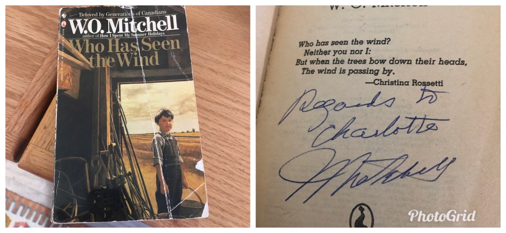 Then when I was attending University I worked at “Aspen Books” in Edmonton. I got to know many authors there and the one who I most enjoyed was W.O. Mitchell. I loved working with Mr. Mitchell and did so a few times as he was the writer in residence at the University. He eventually called me the “best mackerel splitter” he’d ever worked with… as I had good timing at opening the books and sliding them in front of him as he finished up with the previous customer.  The last time I worked with Mr. MItchell I was finally brave enough to take in my copy of “Who Has Seen The Wind” that was battered and damaged from years of reading. He said that meant that a book was well-loved and grinned at me. I still have it.