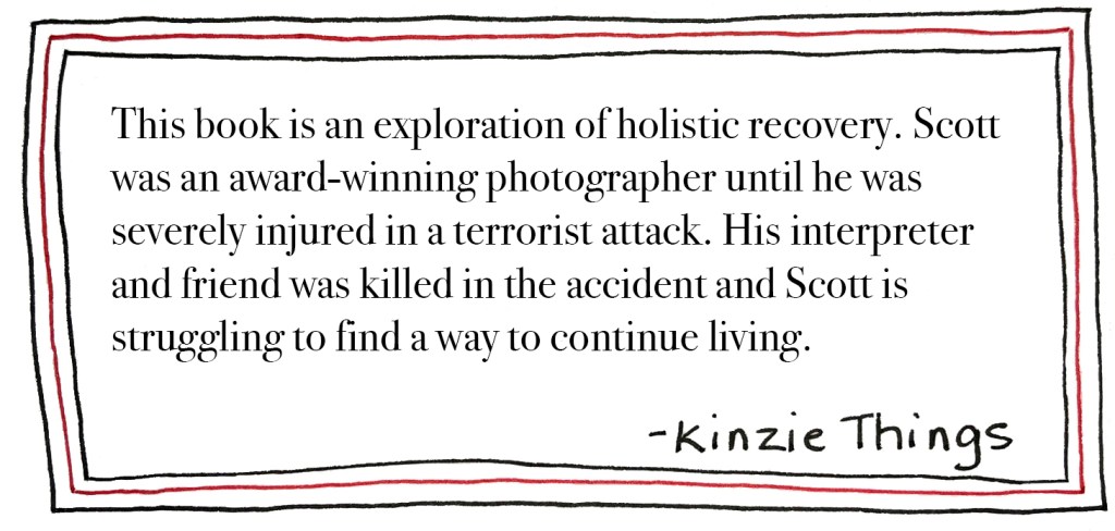 This book is about a man named Scott. He was a photographer and is dealing with the aftermath of a terrible event. He was injured seriously by a terrorist bombing while working and his friend and interpreter was killed. Scott not only has serious physical injuries to recover from, but he struggles with PTSD, guilt, and other life-changing thoughts and feelings.